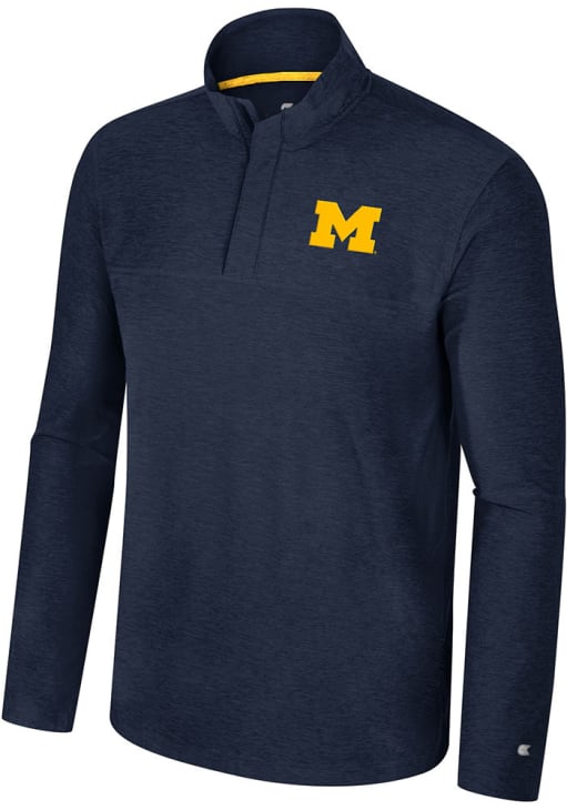 Embrace the warmth and showcase your Wolverines pride with our Michigan Wolverines Long Sleeve Qtr Zip Pullover. This Mens Blue Marty Long Sleeve Pullover offers a screenprint primary logo on left chest for the perfect combination of comfort and style. Elevate your everyday look with this must-have Michigan Wolverines Long Sleeve Qtr Zip Pullover.