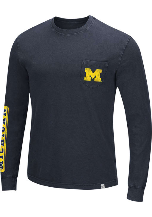 Show your Michigan Wolverines spirit in this Michigan Blue T Shirt! This Michigan Leg Lamp Long Sleeve T Shirt makes a great layer for cooler nights cheering on the Wolverines. Featuring a screen print of team logo on front pocket with team name graphic on back, this Michigan Wolverines Long Sleeve Tee is an essential addition for every fan. Go Michigan!