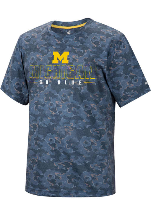 Stay cool and display your Michigan Wolverines spirit in this Blue Pyrotechnics Camo T Shirt. This Short Sleeve is the perfect Tee for working out, heading to class, or cheering on the Wolverines. Showcasing a rubberized screen print of team name and logo on front chest, there's no mistaking your Michigan Wolverines pride in this Wolverines Pyrotechnics Camo T Shirt!