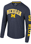 Show your Michigan Wolverines spirit in this Michigan Blue T Shirt! This Michigan Reese Long Sleeve T Shirt makes a great layer for cooler nights cheering on the Wolverines. Featuring a rubberized print of arched team name over mascot on front chest with team slogan on left sleeve, this Michigan Wolverines Long Sleeve Tee is an essential addition for every fan. Go Michigan!