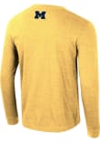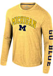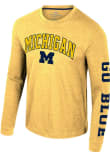 Show your Michigan Wolverines spirit in this Michigan Yellow T Shirt! This Michigan Reese Long Sleeve T Shirt makes a great layer for cooler nights cheering on the Wolverines. Featuring a rubberized print of arched team name over mascot on front chest with team slogan on left sleeve, this Michigan Wolverines Long Sleeve Tee is an essential addition for every fan. Go Michigan!