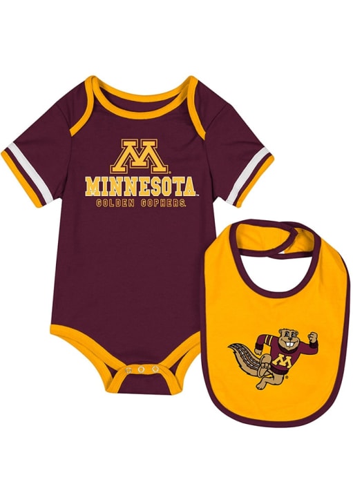 Your little Golden Gophers fan will look adorable in this Baby Maroon Minnesota Golden Gophers The Gift One Piece with Bib! This Minnesota Golden Gophers Romper with Bib features a screen print graphic.