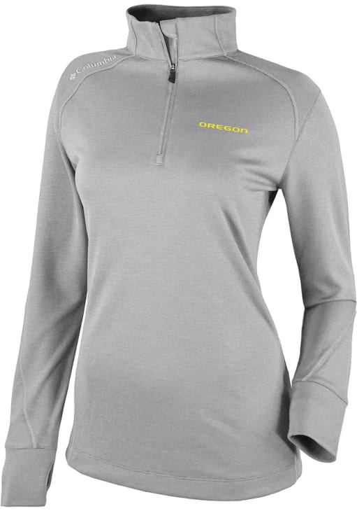 Embrace the warmth and showcase your Ducks pride with our Oregon Ducks Long Sleeve Qtr Zip. This Womens Grey Heat Seal Omni Wick Shotgun 2.0 Long Sleeve Pullover offers a heat seal team logo for the perfect combination of comfort and style. Elevate your everyday look with this must-have Oregon Ducks Long Sleeve Qtr Zip.