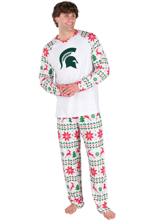 Product Details Product Details Digital TransferButtery soft fabricBold fair isle inspired holiday printClassic Raglan LS top and open leg bottomPerfect set for your holiday celebrations92% POLYESTER/8% SPANDEX Officially Licensed Get Michigan State Spartans fan ready for sweet dreams of gameday with this White Mens Sleep Pants Loungewear! This Sleep Pants Loungewear features a holiday design and team logo and is ready to be sported by any fan.