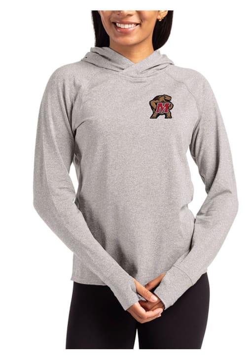 Embrace your Terrapins pride and showcase your team spirit with confidence in this Maryland Terrapins Long Sleeve Hoodie! Stay warm and stylish with the Maryland Womens Grey Adapt Knit Hood Hooded Sweatshirt. Designed with team logo on left chest, this Terrapins Long Sleeve Hoodie is a must-have for dedicated fans.