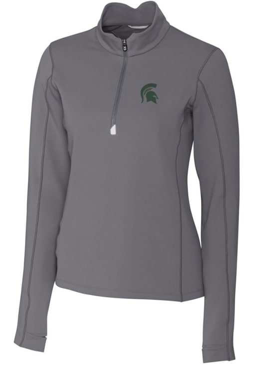 Embrace the warmth and showcase your Spartans pride with our Michigan State Spartans Long Sleeve Qtr Zip. This Womens Grey Traverse Long Sleeve Pullover offers a high quality 2-ply DryTec matte finish polyester for the perfect combination of comfort and style. Elevate your everyday look with this must-have Michigan State Spartans Long Sleeve Qtr Zip.