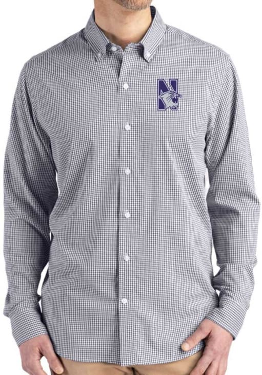 Mens Northwestern Wildcats Black Cutter and Buck Gingham LS Woven Long Sleeve Dress Shirt
