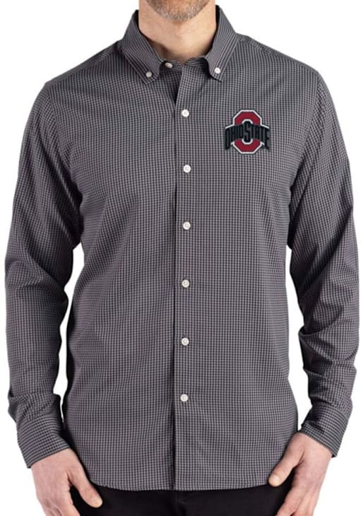 Mens Ohio State Buckeyes Black Cutter and Buck Gingham LS Woven Long Sleeve Dress Shirt