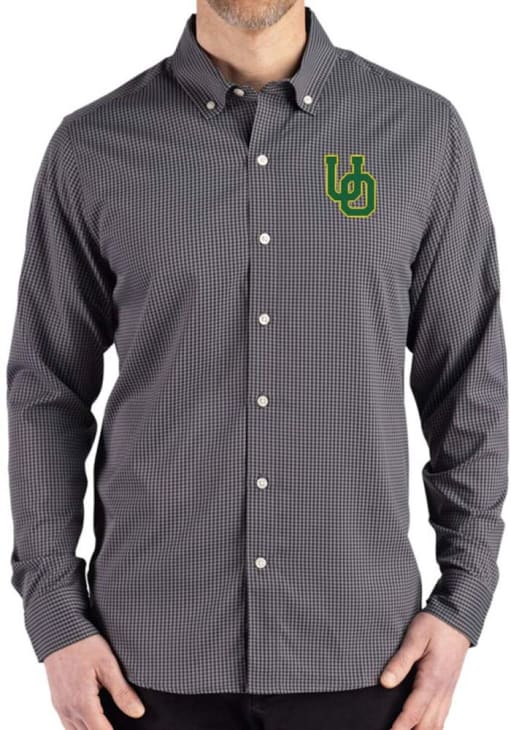 Mens Oregon Ducks Black Cutter and Buck Gingham LS Woven Long Sleeve Dress Shirt