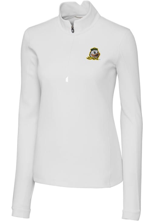 Embrace the warmth and showcase your Ducks pride with our Oregon Ducks Long Sleeve Qtr Zip. This Womens White Traverse Long Sleeve Pullover offers a high quality 2-ply DryTec matte finish polyester for the perfect combination of comfort and style. Elevate your everyday look with this must-have Oregon Ducks Long Sleeve Qtr Zip.