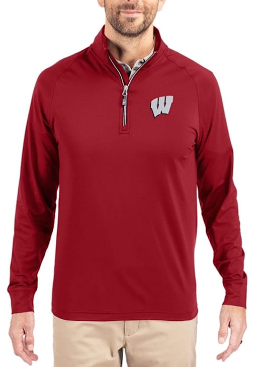 Mens Wisconsin Badgers Cardinal Cutter and Buck Adapt Eco Knit Qtr Zip Pullover