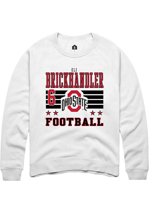 Support your Ohio State Buckeyes and favorite Eli Brickhandler in this Ohio State Buckeyes Mens White NIL Striped Player Crew. This Crew Sweatshirt features a NIL graphic, and is sure to stand out in the stadium. Perfect to wear on game day or any day!
