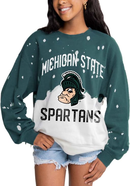 Gear up for the ultimate game day experience with this remarkable Michigan State SpartansWomens Green Twice As Nice Faded Crew Sweatshirt! Designed with the true fan in mind, this Spartans Long Sleeve Sweatshirt features a screen print team name and logo on center chest. Stay warm and comfortable with this Womens MSU Spartans Crew Sweatshirt.