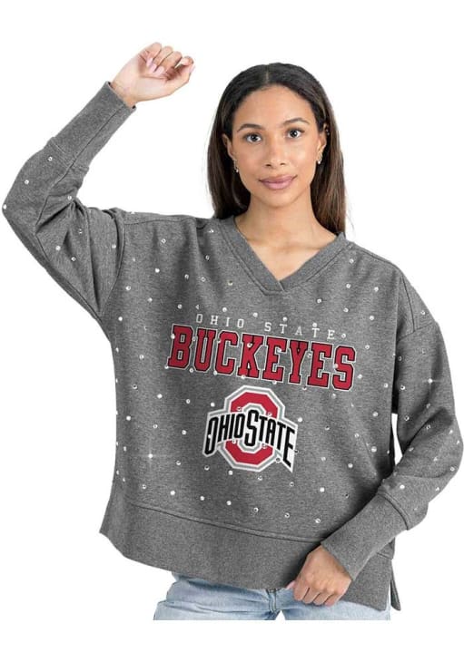 Gear up for the ultimate game day experience with this remarkable Ohio State BuckeyesWomens Grey Most Wanted Crew Sweatshirt! Designed with the true fan in mind, this Buckeyes Long Sleeve Sweatshirt features a screenprint team name and team logo on center chest with all over rhinstone. Stay warm and comfortable with this Womens The Ohio State University Buckeyes Crew Sweatshirt.