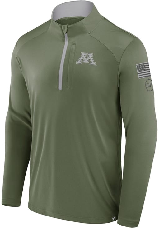 Embrace the warmth and showcase your Golden Gophers pride with our Minnesota Golden Gophers Long Sleeve Qtr Zip Pullover. This Mens Olive OHT Defender Long Sleeve Pullover offers a heat seal of team graphic on left chest for the perfect combination of comfort and style. Elevate your everyday look with this must-have Minnesota Golden Gophers Long Sleeve Qtr Zip Pullover.