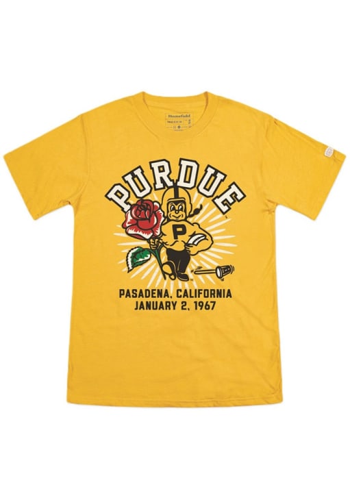 Support your Purdue Boilermakers in this Gold Short Sleeve Fashion Tee! This Football 1967 Rose Bowl Fashion T Shirt features a screen print team graphic on front chest. Be ready to yell "Hail Purdue" when you wear this Purdue Short Sleeve Fashion T Shirt in your favorite stadium or on the street.