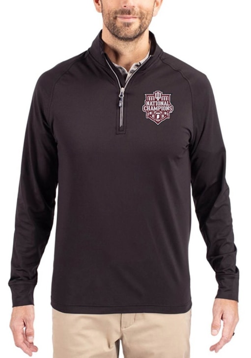 Mens Indiana Hoosiers Black Cutter and Buck 2025 CFP National Champions Adapt Eco Knit Qtr Zip Pul..