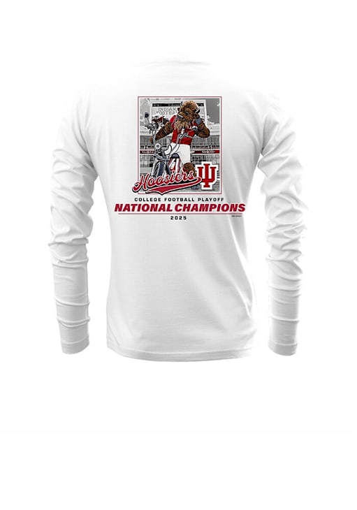 Show your Indiana Hoosiers spirit in this Indiana White T Shirt! This Indiana 2025 College Football National Champions Bison Stadium Long Sleeve T Shirt makes a great layer for cooler nights cheering on the Hoosiers. Featuring a screen print graphic on front left chest and back, this Indiana Hoosiers Long Sleeve Tee is an essential addition for every fan. Indiana, Our Indiana!