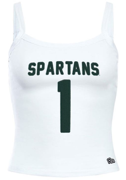 Elevate your tailgating style with this Michigan State Spartans Womens Tank Top. Stay fashionable and comfortable in the refreshing White Playmaker Sleeveless Shirt. Discover the enticing details of this MSU Tank Top, showcasing a applique team name at center chest that's sure to impress.