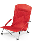 - Heavy-duty, fold-flat portable beach chair that has padded armrests