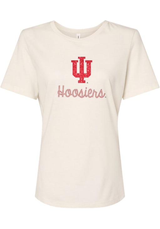 Display your team spirit with this remarkable Indiana Hoosiers Natural Rhinestone Short Sleeve T-Shirt! The Indiana Short Sleeve Tee showcases a rhinestone team name and logo on center chest that truly sets it apart. Stand out from the crowd and proudly declare your allegiance to the Hoosiers with this exceptional Natural Indiana T-Shirt. Indiana, Our Indiana!