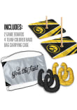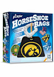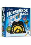- Includes 2 all-wood game boards with 14" wood posts, 4 team-colored horseshoe bags, bag carrying case
