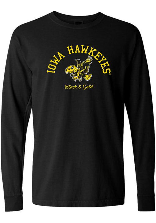 Show your Iowa Hawkeyes spirit in this Hawkeyes Black T-Shirt! This Hawkeyes Comfort Colors Long Sleeve T-Shirt makes a great layer for cooler nights cheering on the Hawkeyes. Featuring a screen print team name and logo on center chest, this Iowa Hawkeyes Long Sleeve LS Tee is an essential addition for every fan. Go Hawkeyes!