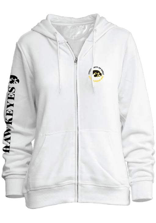 Make a bold statement with your Hawkeyes pride with this Iowa Hawkeyes Full Zip Jacket. Show your team spirit in style in this Womens White Comfy Long Sleeve Full Zip. Make a statement in this Iowa Hawkeyes Womens Long Sleeve Full Zip Jacket, which features a screen print team name and logo left chest with team slogan and logo down right arm.