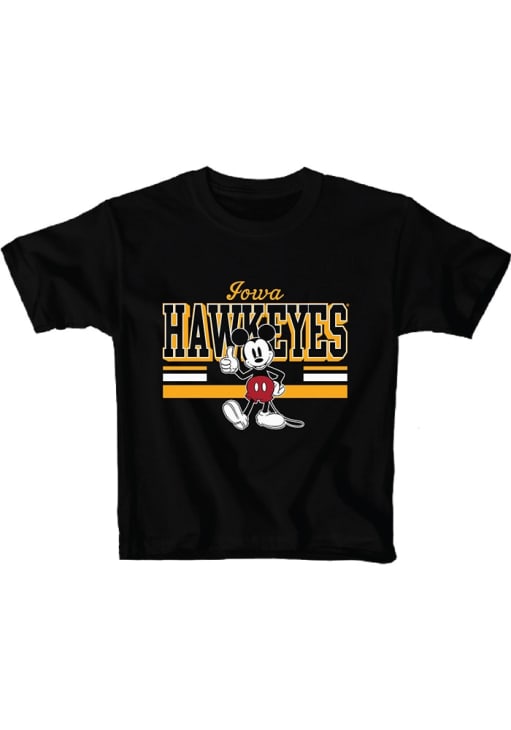 Product Details Product Details Screen printed graphic on center chestCover seam stitched on collarRelaxed fitDouble needle stitched sleeves and bottom hemShort sleeveCrew neckPerfect for young fans!100% Cotton Officially Licensed Your future Iowa Hawkeyes will be gameday ready in this BlackYouth Short Sleeve Tee. This Mickey T-Shirt features a screen print team graphic.