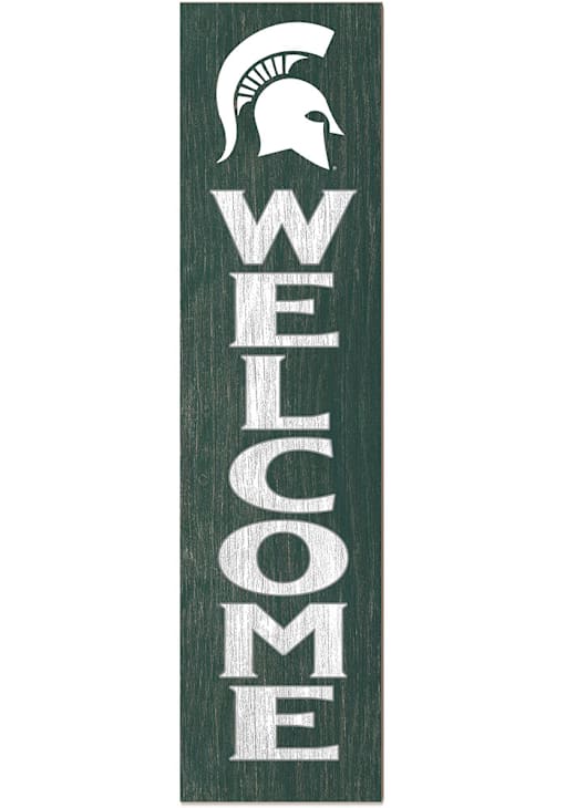 This Michigan State Spartans Porch Leaner Design Sign is great for decorating your home Spartans team spirit. Take your team spirit to the next level with this Sign, which features a "WELCOME" with team color logo helmet as the letter "O". Go Spartans!