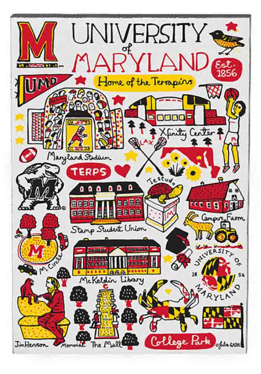 Showcase your Maryland Terrapins spirit on your fridge at work or at home with this Maryland Terrapins Julia Gash Jumbo Magnet. This Magnet features a hand drawn illustrations of campus landmarks by Julia Gash.