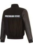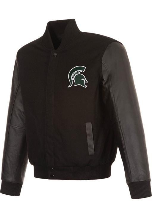 - Wool-blend body and leather sleeves