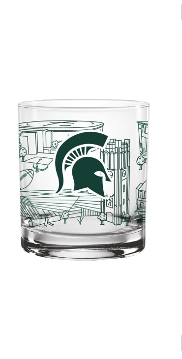 Product Details Product Details One glass per orderCampus print featuredHolds 14ozStrong and durable glassHand wash, drip dryGLASS Officially Licensed This Michigan State Spartans 14oz Campus Rock Glassis a great way to show your Spartans spirit while enjoying your favorite drink. This Rock Glass features a Campus Building Design on Clear Background. Go Spartans!