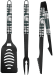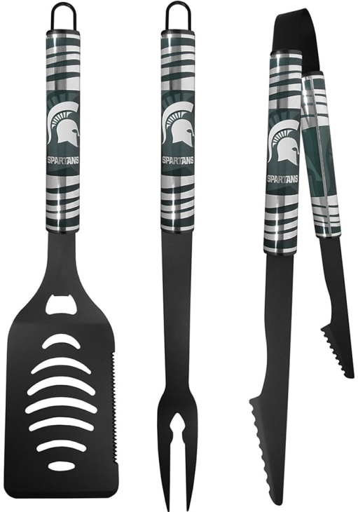 - Grill set includes: spatula with bottle opener and serrated edge, fork and tongs