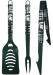 - Grill set includes: spatula with bottle opener and serrated edge, fork and tongs
