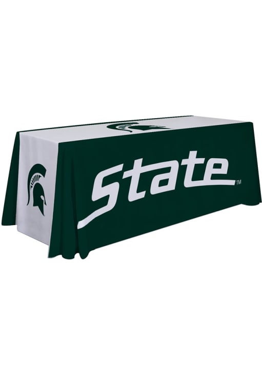 Michigan State Spartans 6 Ft Striped Fabric Tablecloth will keep your table top clean at your next Spartans party. This Tablecloth features a Michigan State University logo in vibrant team colors. This awesome high end table throw covers 4 sides of the table, is flame retardant, made of premium polyester poplin fabric, and is machine washable and wrinkle resistant.