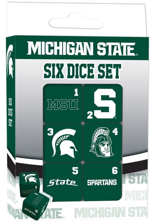 Product Details Product Details 6 Dice IncludedFeatures team logo in team colorTeam color dots on diceMakes for a great gift! Officially Licensed Have fun and show support for your team with this Michigan State Spartans 6 Piece Dice Set Game. This Game features a team color and team logo for hours of Spartans fun.
