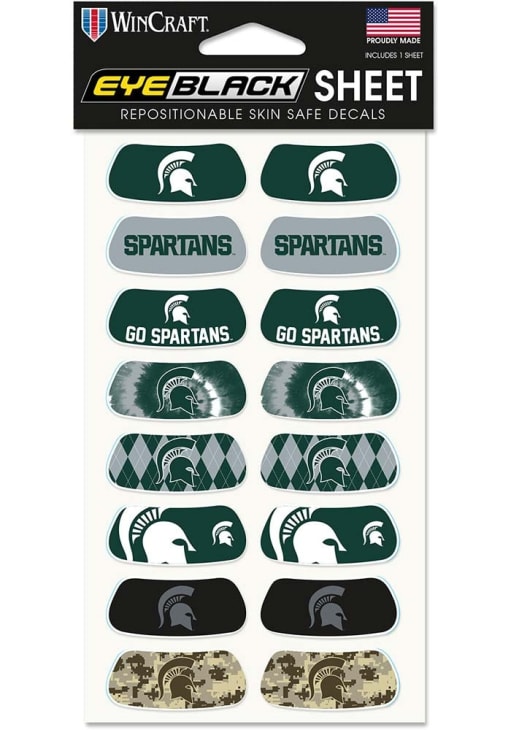 Product Details Product Details Eight different logo designsTeam color logosRepositionableSkin safeGreat accessory for game day!Contains 16 peel and stick face tattoos or 8 pairs of eye black stickers. Officially Licensed Show off your Spartans pride with this Michigan State Spartans 8pk Eye Black Tattoo. This Tattoo features a team color logo.