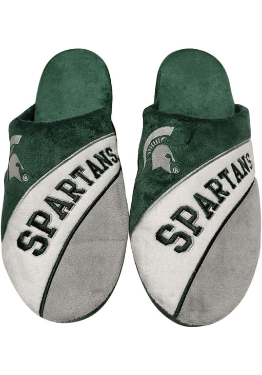 Product Details Product Details All over team-colored designEmbroidered team logo and wordmarkSuper soft plush materialGripped outsoles to avoid slippingGreat for watching the game from home!Small fits men's 7-8Medium fits men's 9-10Large fits men's 11-12XL fits men's 13-14 Officially Licensed Make gamedays more comfortable with these Michigan State Spartans Action Curve Wordmark Mens Slippers from Rally House! Show Spartans support with these Mens Slippers featuring team colors and team logo.