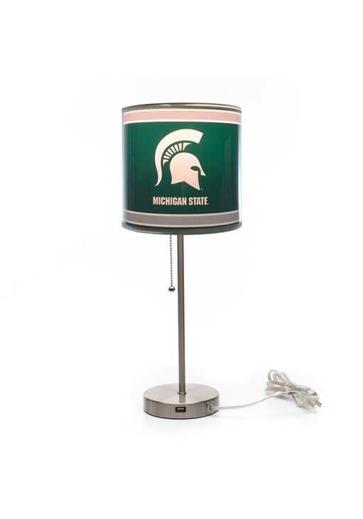 Product Details Product Details With USB Docking StationPull chain switch with team logoCharge up your phone or tablet close by5 Foot CordLampshade insert is printed with a high resolution design Officially Licensed Michigan State Spartans Chrome Lamp Table Lamp is a great way to shed some light in your Spartans fan cave. This Table Lamp features a team logo with team colors.