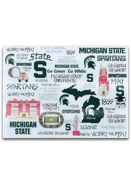 Product Details Product Details Measures 11"x15"Made of tempered glass material4 rubber counter protectors on backsideFun whimsical design with school logos and iconsUse as a cutting board or charcuterie board Officially Licensed Your friends and family will love the Spartans snacks you make with this Michigan State Spartans Glass Cutting Board. Celebrate your favorite team with the perfect snacks using this Cutting Board, which features a team logo and colors.
