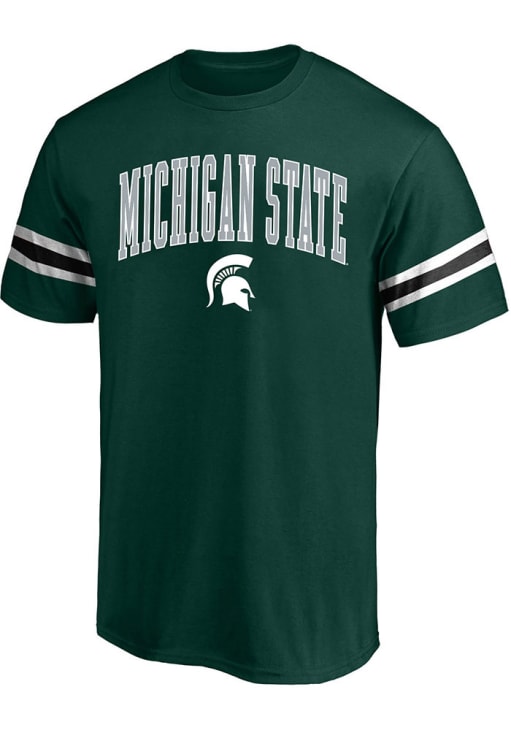 Display your team spirit with this remarkable Michigan State Spartans Green Arm Piece Knit Big and Tall T-Shirt! The MSU Big and Tall Tee showcases a screen print team name arched over team logo on front chest with white and secondary color inserts on sleeves that truly sets it apart. Stand out from the crowd and proudly declare your allegiance to the Spartans with this exceptional Green MSU T-Shirt. Go Spartans!