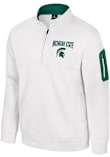 Embrace the warmth and showcase your Spartans pride with our Michigan State Spartans Long Sleeve Qtr Zip Pullover. This Mens White Hits The Road Fleece Long Sleeve Pullover offers a rubberized logo and wordmark on left chest for the perfect combination of comfort and style. Elevate your everyday look with this must-have Michigan State Spartans Long Sleeve Qtr Zip Pullover.