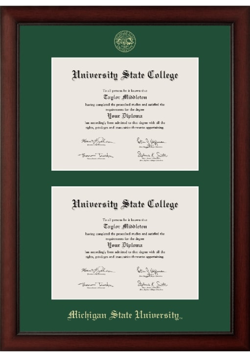 Michigan State Spartans Paxton Double Document Diploma Frame is a great way to keep your Spartans memories close. You'll love looking at your favorite Spartans moments with this Diploma Frame, which features a showcase for your University diploma in a USA-made frame. Overall Size 19"w x 26". Go Spartans!