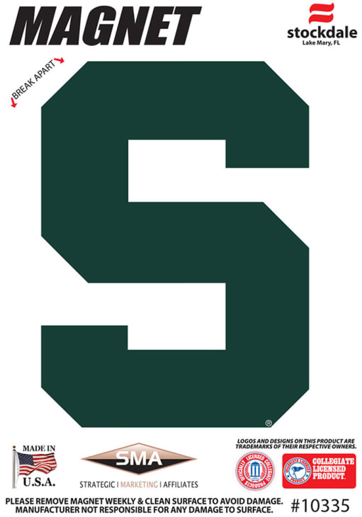 Showcase your MSU Spartans spirit on your fridge at work or at home with this Michigan State Spartans S Logo 3x5 Die Cut Magnet. This Magnet features a team logo on team color background.