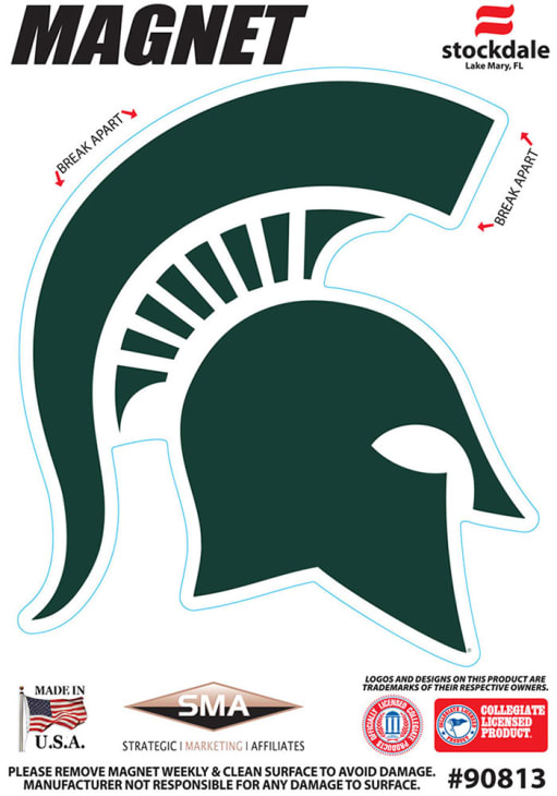Showcase your MSU Spartans spirit on your fridge at work or at home with this Michigan State Spartans Spartans Head 3x5 Die Cut Magnet. This Magnet features a team logo on team color background.