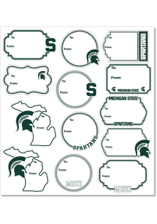 Product Details Product Details Complete your Spartans themed gifts this holiday season with this Michigan State Spartans Team Logo 8"x10" Gift Tags. These Gift Tags features a team color with team logo.