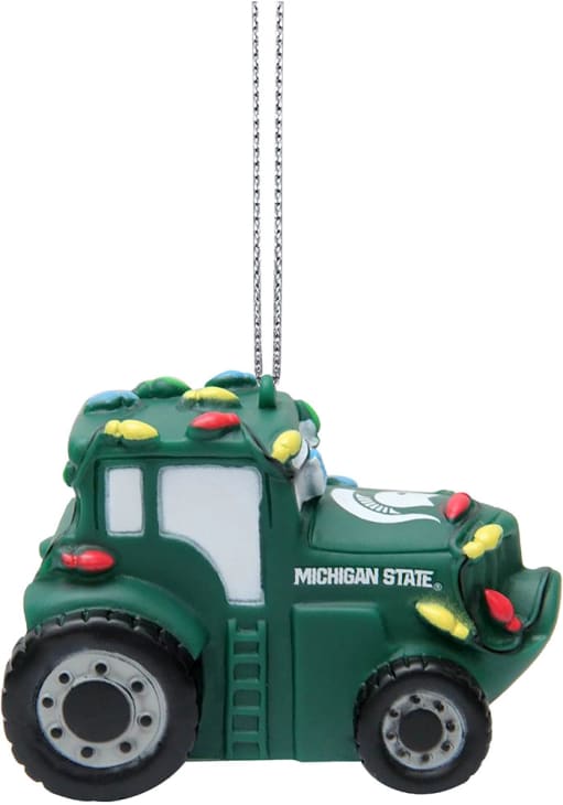 Product Details Product Details Vinyl Tractor OrnamentFeatures team logo and team colorsMeasures approx 3 inMakes for a great giftResin Officially Licensed Decorate your Spartans tree this holiday season with this Michigan State Spartans Vinyl Tractor Ornament. Add MSU features to your holiday cheer. This Ornament features a festive design with team colors and team logo. Go Spartans!