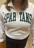Embrace the warmth and showcase your Spartans pride with our Michigan State Spartans Long Sleeve Qtr Zip. This Womens Ash Cropped Long Sleeve Pullover offers a applique team name on center chest for the perfect combination of comfort and style. Elevate your everyday look with this must-have Michigan State Spartans Long Sleeve Qtr Zip.