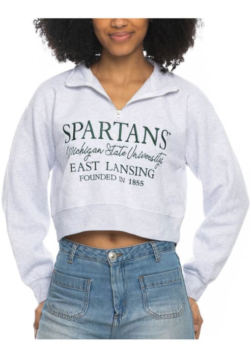 Embrace the warmth and showcase your Spartans pride with our Michigan State Spartans Long Sleeve Qtr Zip. This Womens Ash Sport Long Sleeve Pullover offers a embroidered team name on center chest for the perfect combination of comfort and style. Elevate your everyday look with this must-have Michigan State Spartans Long Sleeve Qtr Zip.